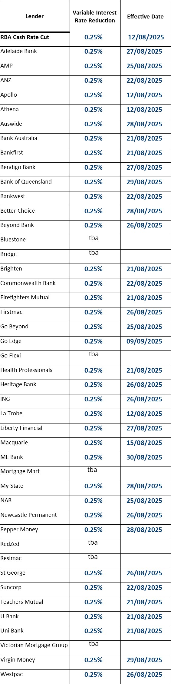 Below is list of each lender we work with. We will update this list with each lender's response to the cash rate reduction as they make their announcements.